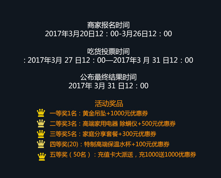 5.参赛商家禁止使用第三方作弊,一经发现作弊行为,将取消参赛资格;一旦发现资料照 片非本人或网络图片将取消参与资格(可举报他人,出示证据并经核实后将取消被举报人参赛资格)